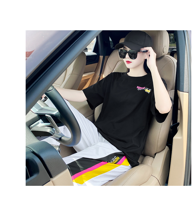 | 商品名称 | シングルサイクル香港軽奢ブランド女装カジュアルファッションセンス女性半袖Tシャツ2021年夏新着商品韓国版洋風レギンススポーツウェア黒Tシャツ白ズボンセトM |