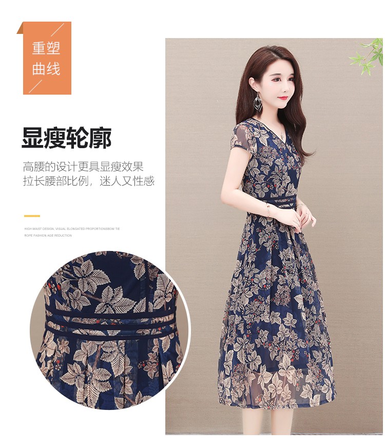 商品名称戈蕾妍ワンピスシフォン21年夏新着商品韓国版ビッグサイズ婦人服中年ママ服カバー腹部顕痩せ中ロングタイプvネック洋風プリントa字スカート小花ビーチスカート青(8559)L(90-105斤を推奨)
