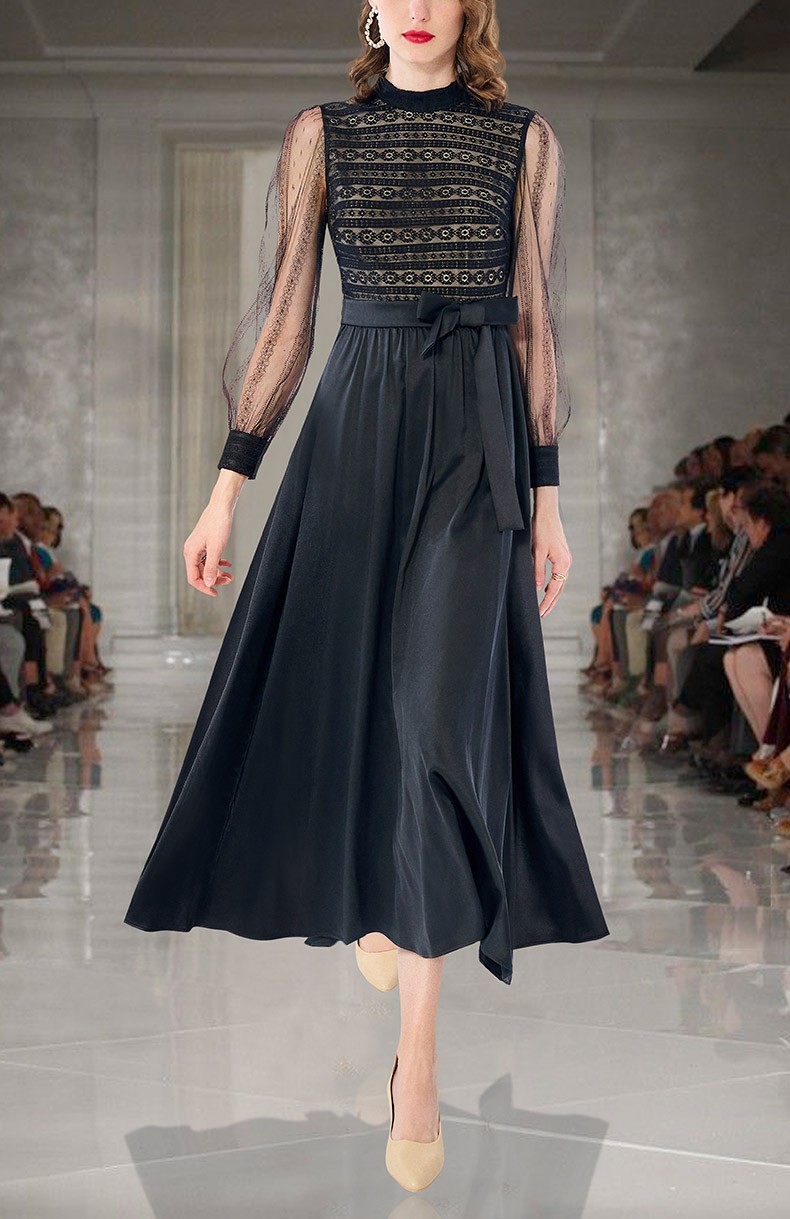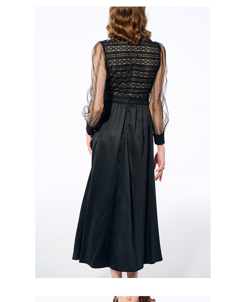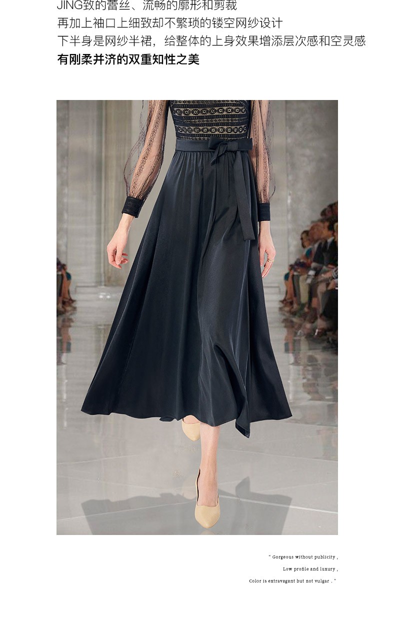 freurwoodレースステッチワンピス女2021秋新商品黒い網の長袖を収めて腰が細くなります。大きなサテンの表面を飾っています。