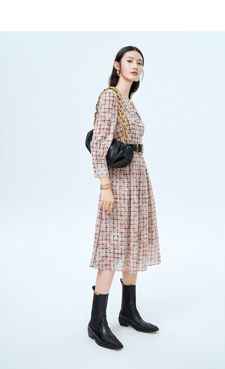 | 商品名称 | 恩裳2021秋季新着商品レトルト襟更衣印花格子高腰中长款透かし刺繍花连衣丝杏色38/M |
